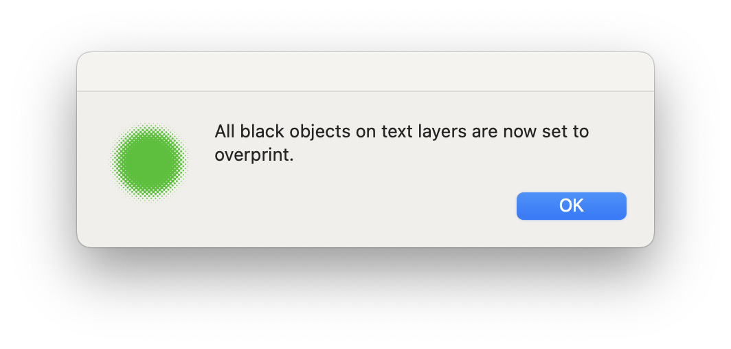 Access the tool in the GreenLight Tools menu GreenLight Custom e.g. GreenLight for Quarto Tools or GreenLight PRO Tools > Text layer [Black] objects overprint