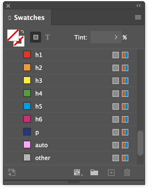 h1 through to h6 tags are striped with colours of the rainbow. Applied colours can be amended in InDesign by editing their swatches (InDesign Window menu > Colo(u)r > Swatches)