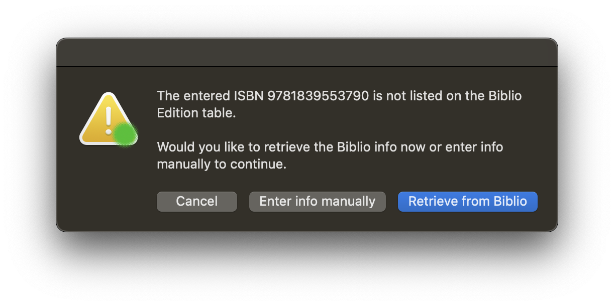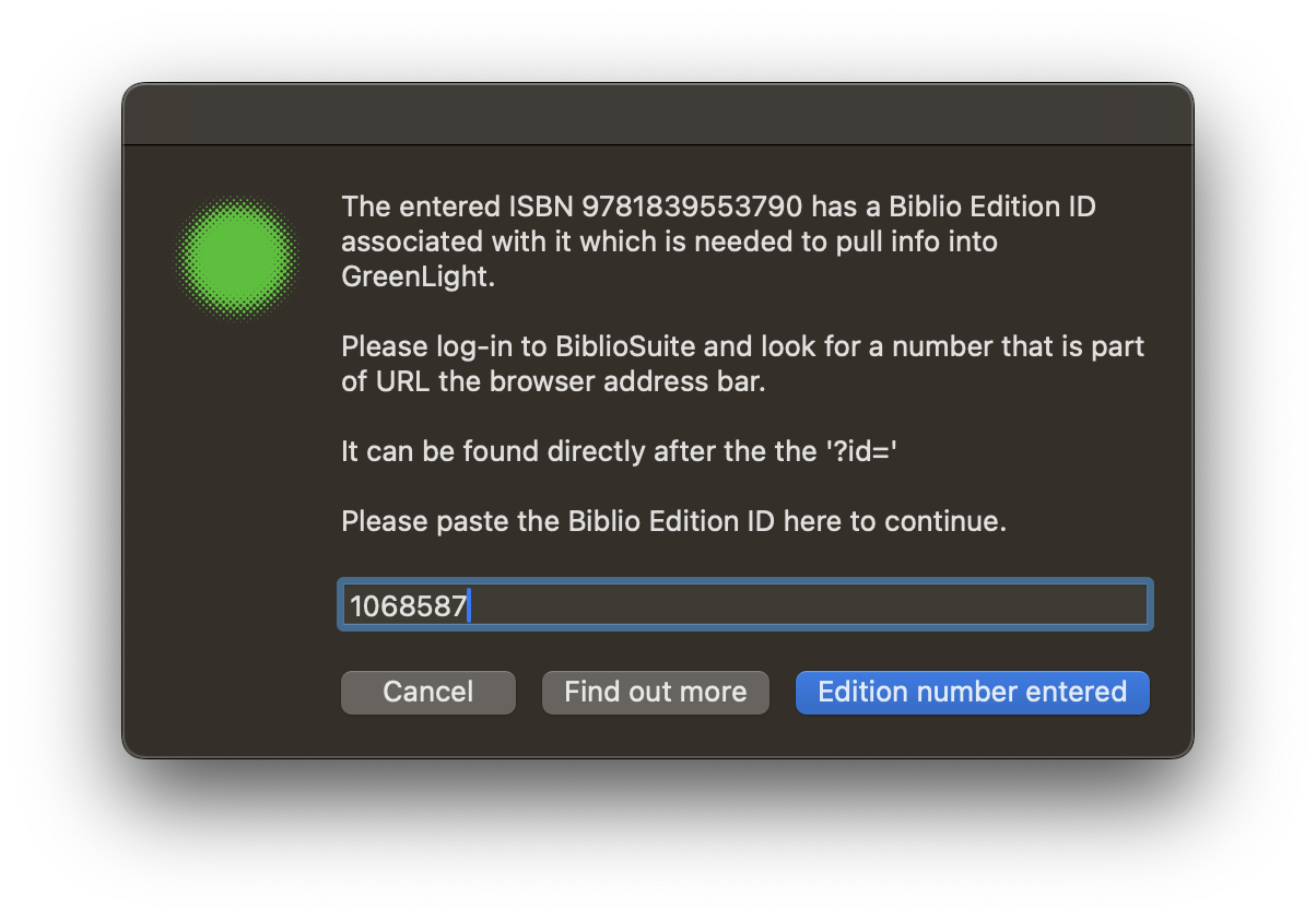 With the Biblio Edition ID number copied, paste the into the GreenLight dialog (in Finder app to allow pasting) and choose Edition number entered to continue.