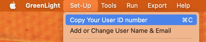 Copy your User ID number with the command GreenLight Set-up menu > Copy Your User ID number in order to paste into an online form when purchasing.
